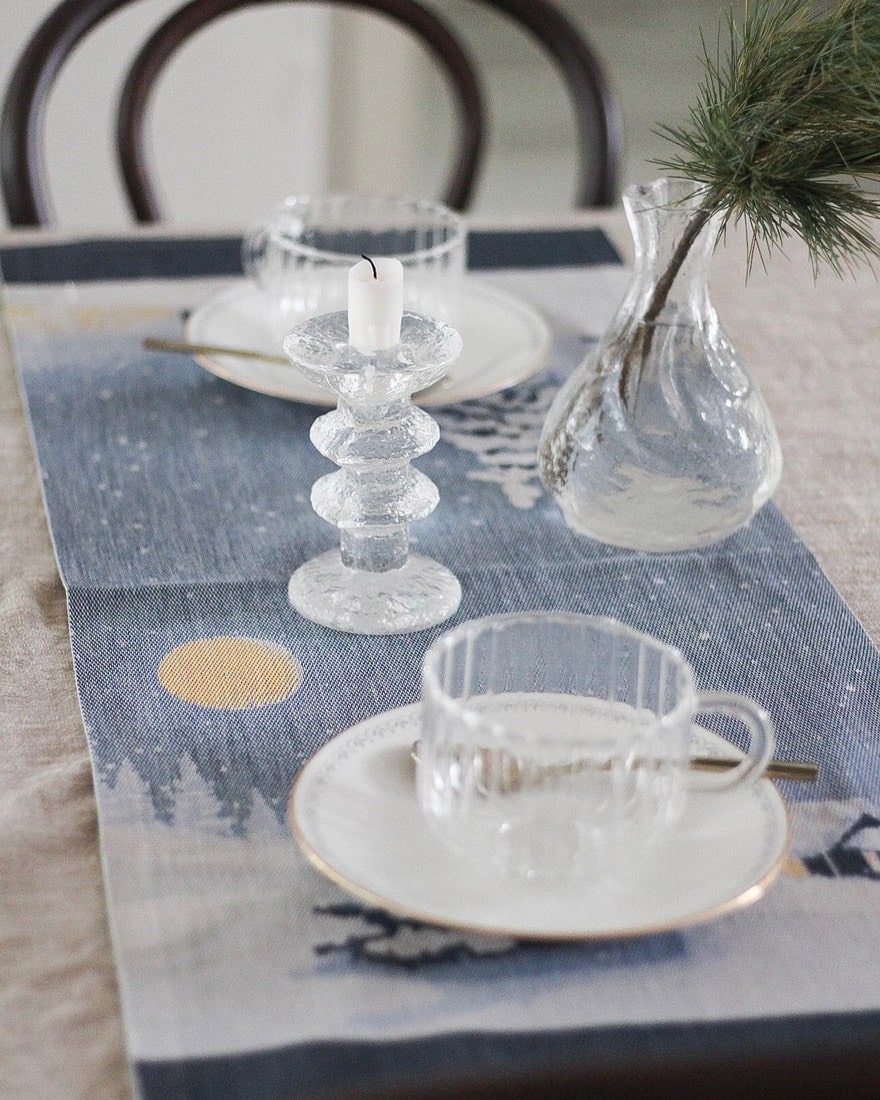 In den Baumwoll-Tischläufer ist eine schöne Schneelandschaft mit einer nordischen Hütte und dem Mond gewebt. Die Textilien von der schwedischen Marke Ekelund sind auch als Geschenk sehr beliebt, denn sie sind langlebig und strapazierfähig. Wenn du einen Tischläufer in höchster Qualität kaufen oder verschenken möchten, ist der Tischläufer „Vinternatt“ die perfekte Wahl.